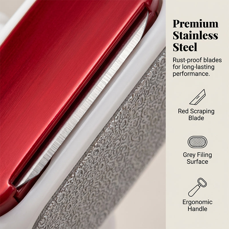 PREMIUM STAINLESS STEEL - Crafted with high-grade stainless steel, the scraping blade and fine filing surface are highly durable, rust-resistant, and designed to provide years of reliable foot care.