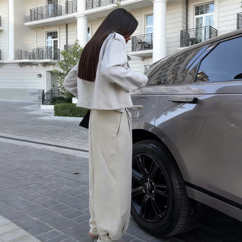 TIE WAISTBAND – The pants feature an adjustable tie waistband that provides a secure yet flexible fit for different body shapes. The design ensures comfort whether sitting, walking, or standing, keeping the pants in place without tightness. Practical and versatile, the waistband supports all-day wear and enhances the overall ease of the set.