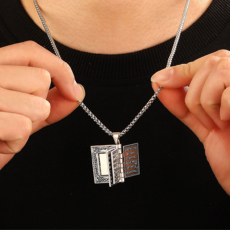 UNIQUE BIBLE-INSPIRED DESIGN: This pendant is crafted in the shape of a miniature Bible with a hinged structure, allowing it to open and close. It symbolizes faith and elegance in a timeless style.