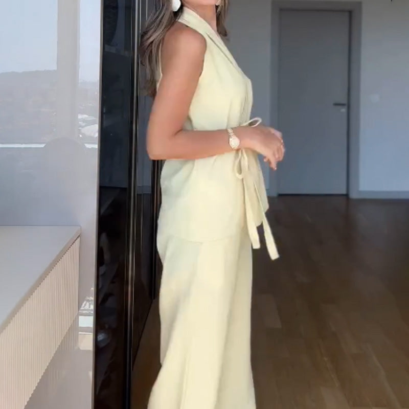 2-PIECE SUIT: This 2-piece suit includes a sleeveless V-neck top with crossed front design and a matching waist belt, paired with high-waisted straight-leg trousers. Designed to offer a polished, professional look that transitions easily from office settings to smart-casual events.